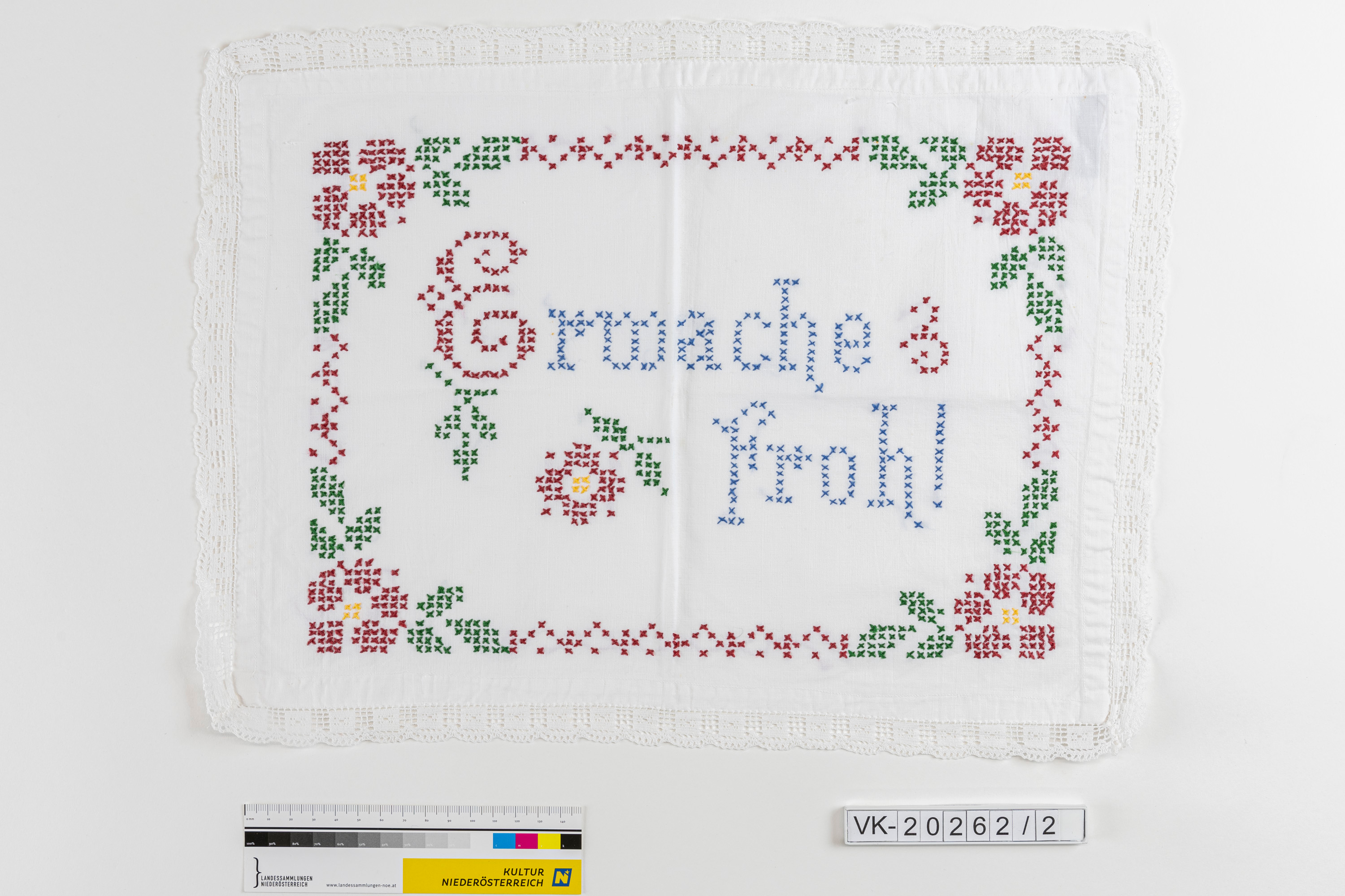 Rechteckiges weißes Deckchen, umlaufend mit weißer Spitze besetzt, mehrfärbig im Kreuzstich bestickt mit einem floralen Rahmen und einer Beschriftung: "Erwache froh!".