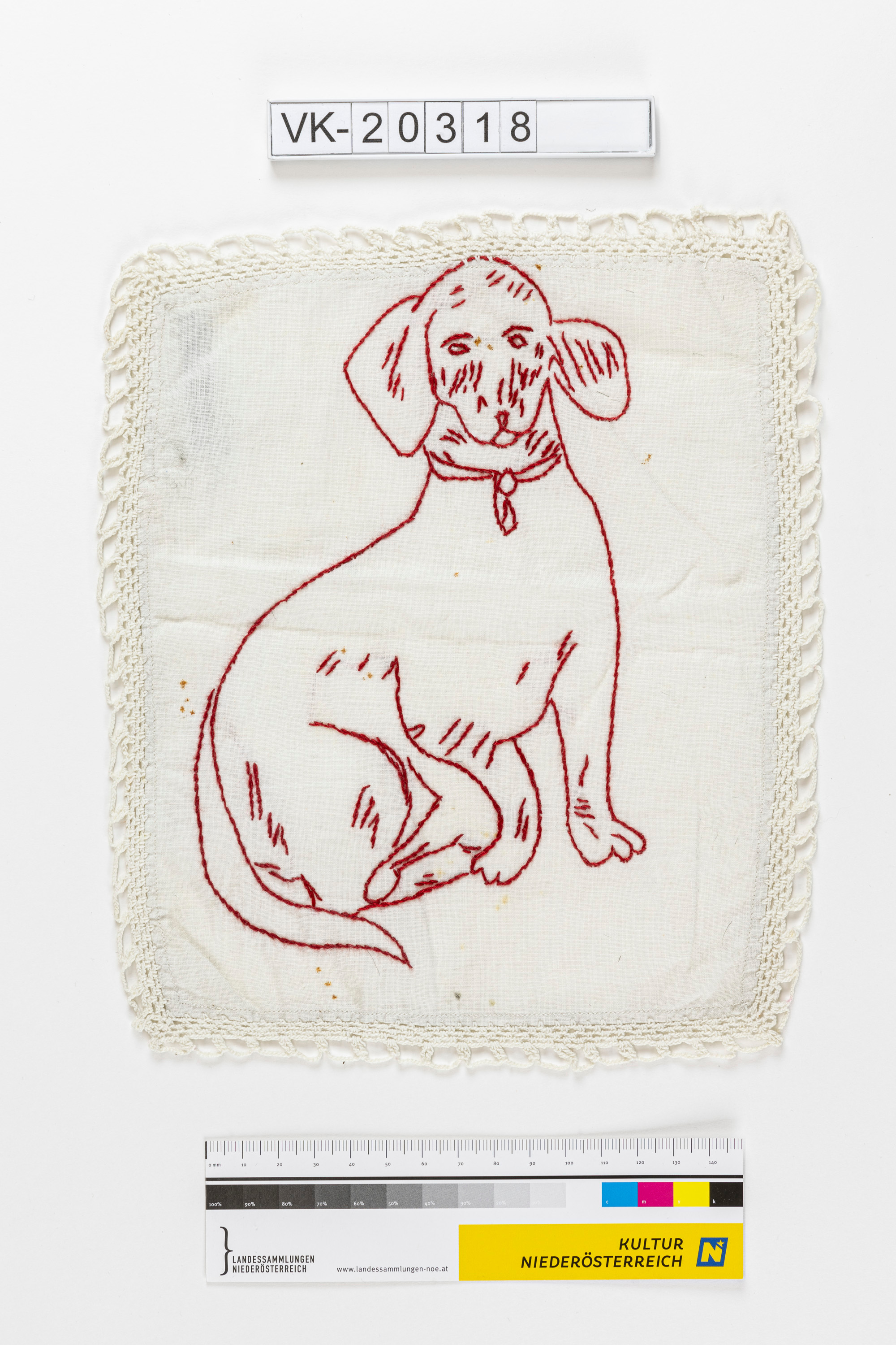 Annähernd quadratisches, weißes Leinendeckchen, umlaufend mit einer weißen Häkelspitze besetzt, bestickt in rot mit einem Dackel. Das Objekt befand sich in der Schachtel, die mit XT 1 bezeichnet wurde.