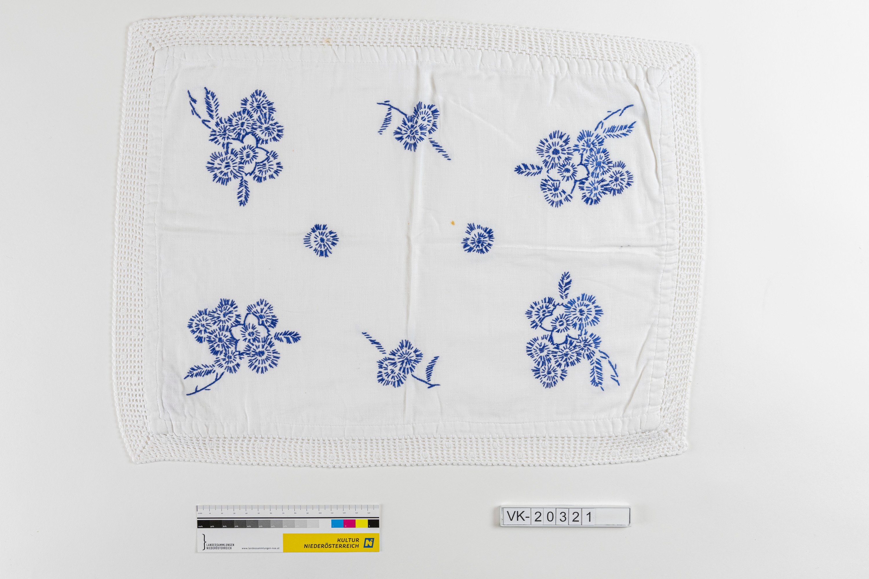 Weißes rechtesckiges Leinendeckchen, umlaufend mit einer weißen Häkelspitze besetzt, in blau bestickt mit Blütenmotiven. Das Objekt befand sich in der Schachtel, die mit XT 1 bezeichnet wurde.