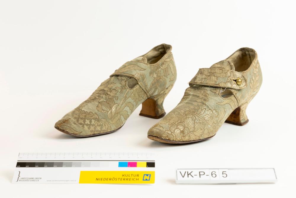 Ein Paar (a, b) halbhohe Damenschuhe mit hoch gezogener Querlasche (mit einem Knopf) und halbhohem Barockabsatz. Die Schuhe sind aus floral gemustertem, grün-beigem Damast und haben eine Ledersohle.
