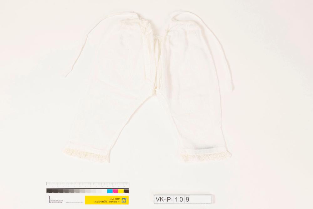 Weiße Puppenunterhose aus Baumwollbatist, mit Bindebändchen und Spitzenabschluss an den Hosenbeinen.