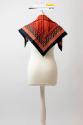 Seidentuch mit blaugrüner Grundfarbe, bedruckt mit geometrischen Elementen in verschiedenen Farben. Der Rand ist weiß rolliert.
