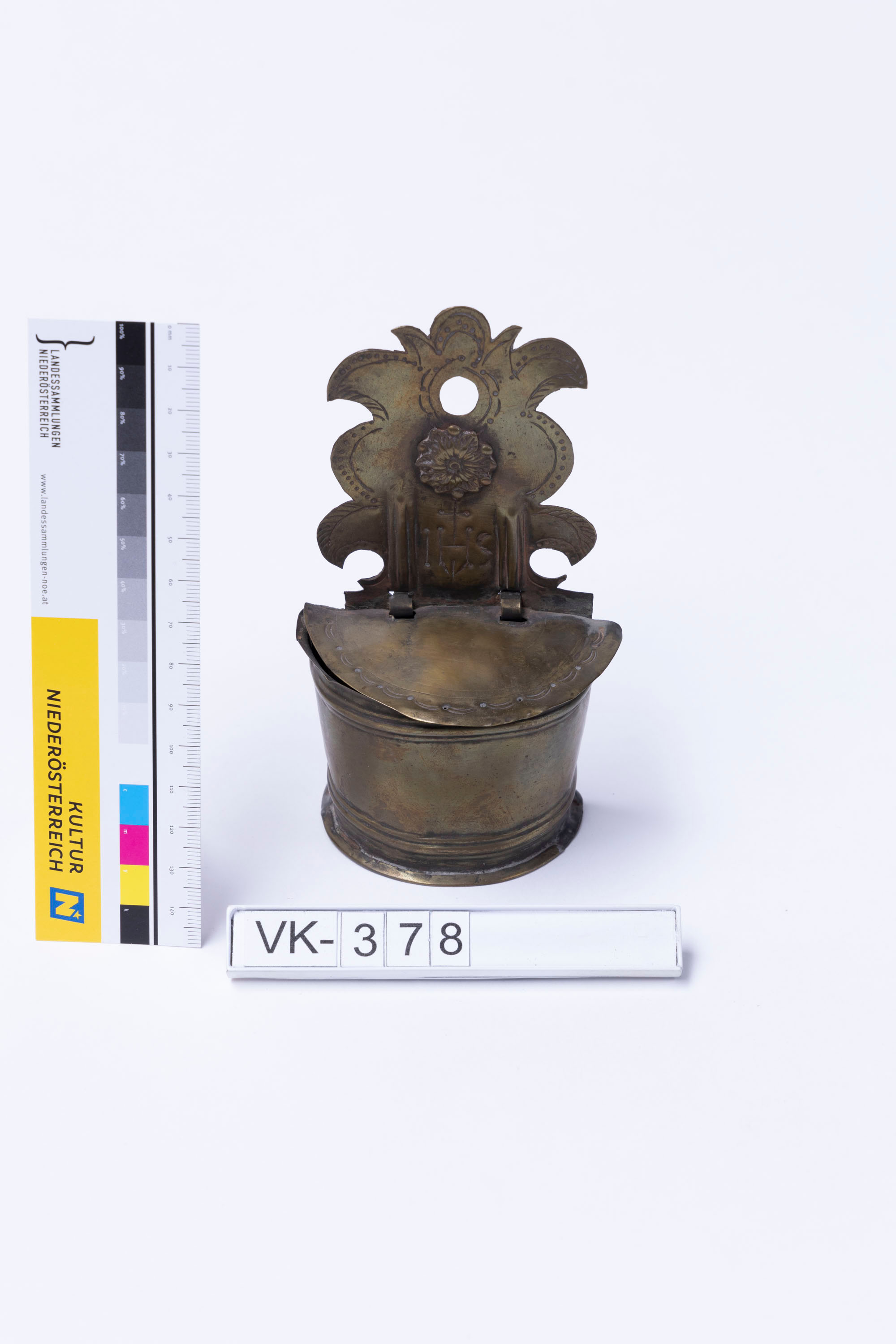 Weihbrunnkessel aus getriebenem Messingblech, mit Klappdeckel und verlötetem Boden. Die Rückseite ist im oberen Bereich geschweift beschnitten, und mit einer Rosette und einem Christusmonogramm verziert.