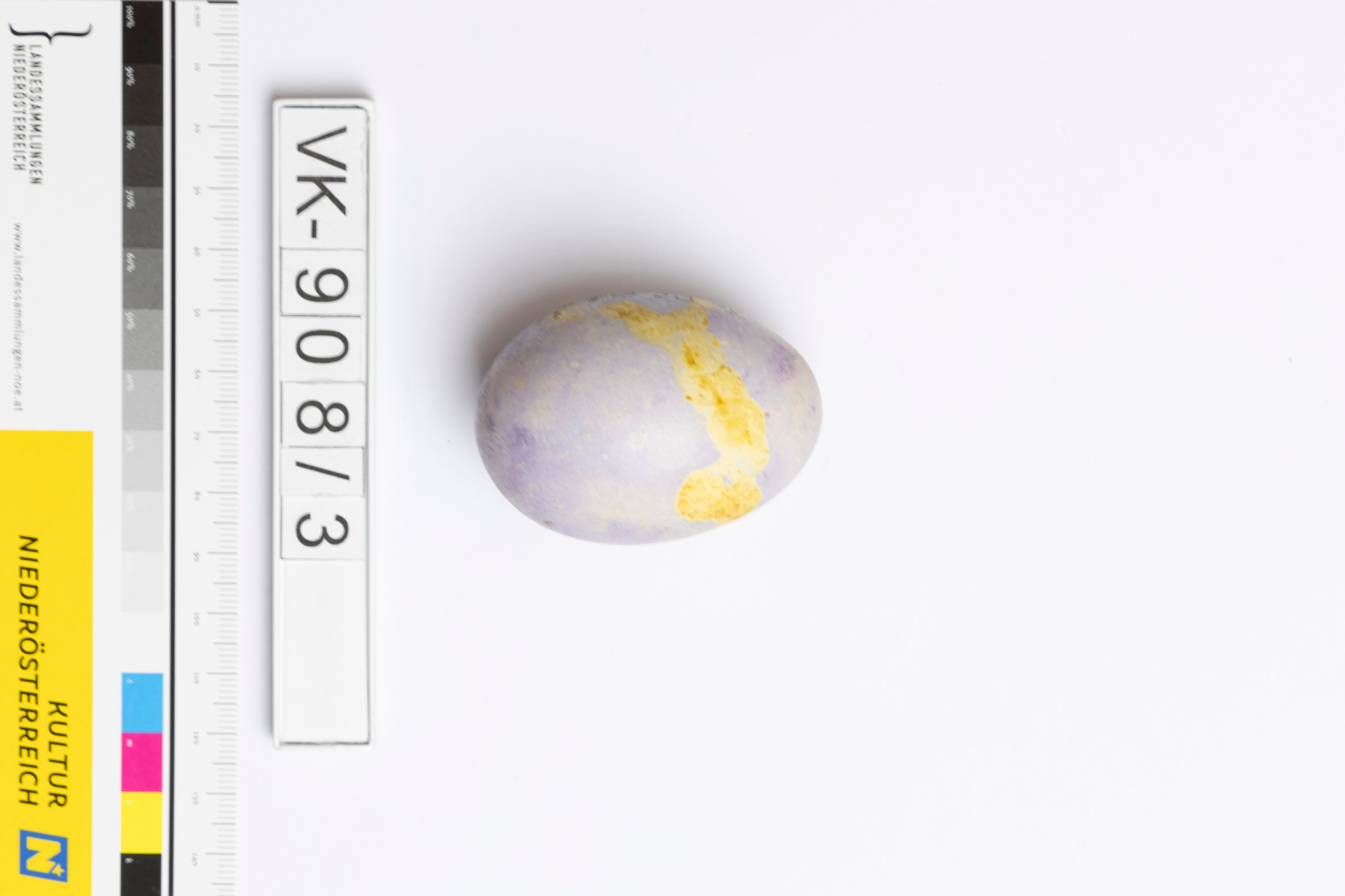 Osterei (nicht ausgeblasen) mit blassvioletter Farbe, gelblicher Verschmutzung und einer Beschriftung mit schwarzer Tusche: "Fr. Ph. Sch. 1908".