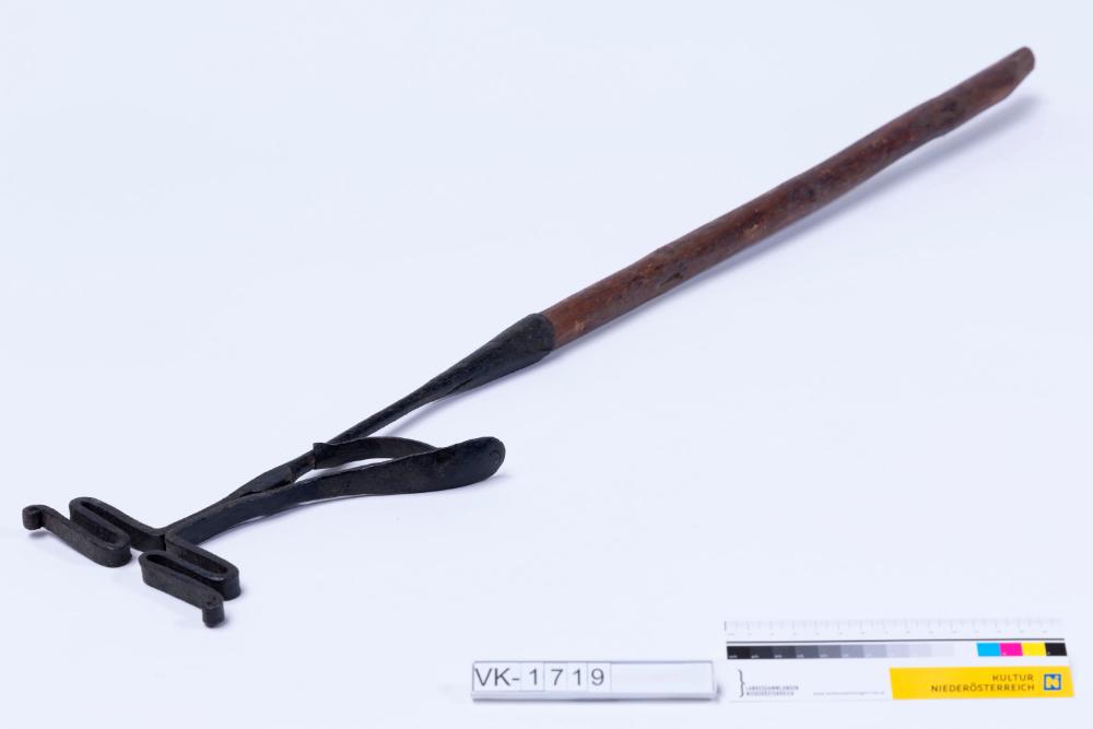 Kienspanhalter mit Federklemmgriff, zweiseitiger Haltevorrichtung und angeschmiedeter Tülle. In die Tülle ist ein Holzstiel eingesetzt. VK-21237, VK-21238 und VK-21239 sind Sockel für Kienspanhalter.