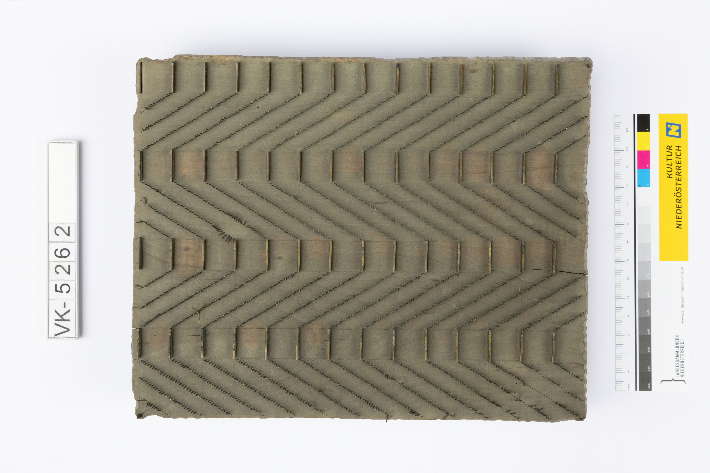 Färbermodel aus Holz mit Metallstiften und Metallelementen auf einer Trägerplatte mit zwei Kerben. Druckmuster: Gestufte Linien, abwechseln voll und gepunktet, (laut Inventarbuch Muster Nr. 131 des Druckers).