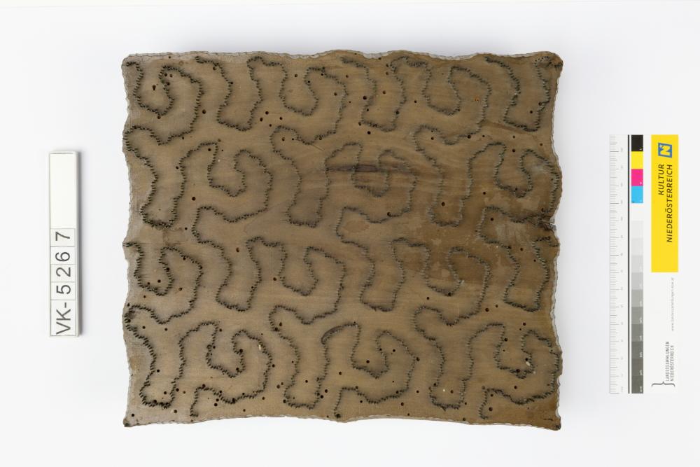 Färbermodel aus Holz mit Metallstiften auf einer Trägerplatte mit zwei Kerben. Druckmuster: Schlängelnde gepunktete Linien, (laut Inventarbuch Muster Nr. 135 des Druckers).