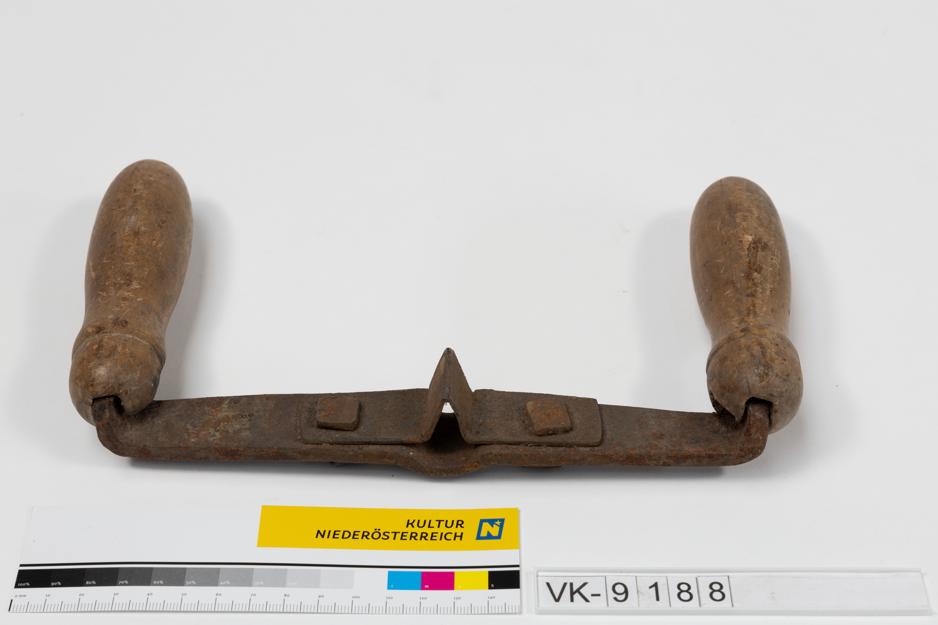 Schindelnutzieher mit aufgenieteter Klinge und zwei gedrechselten Holzgriffen.