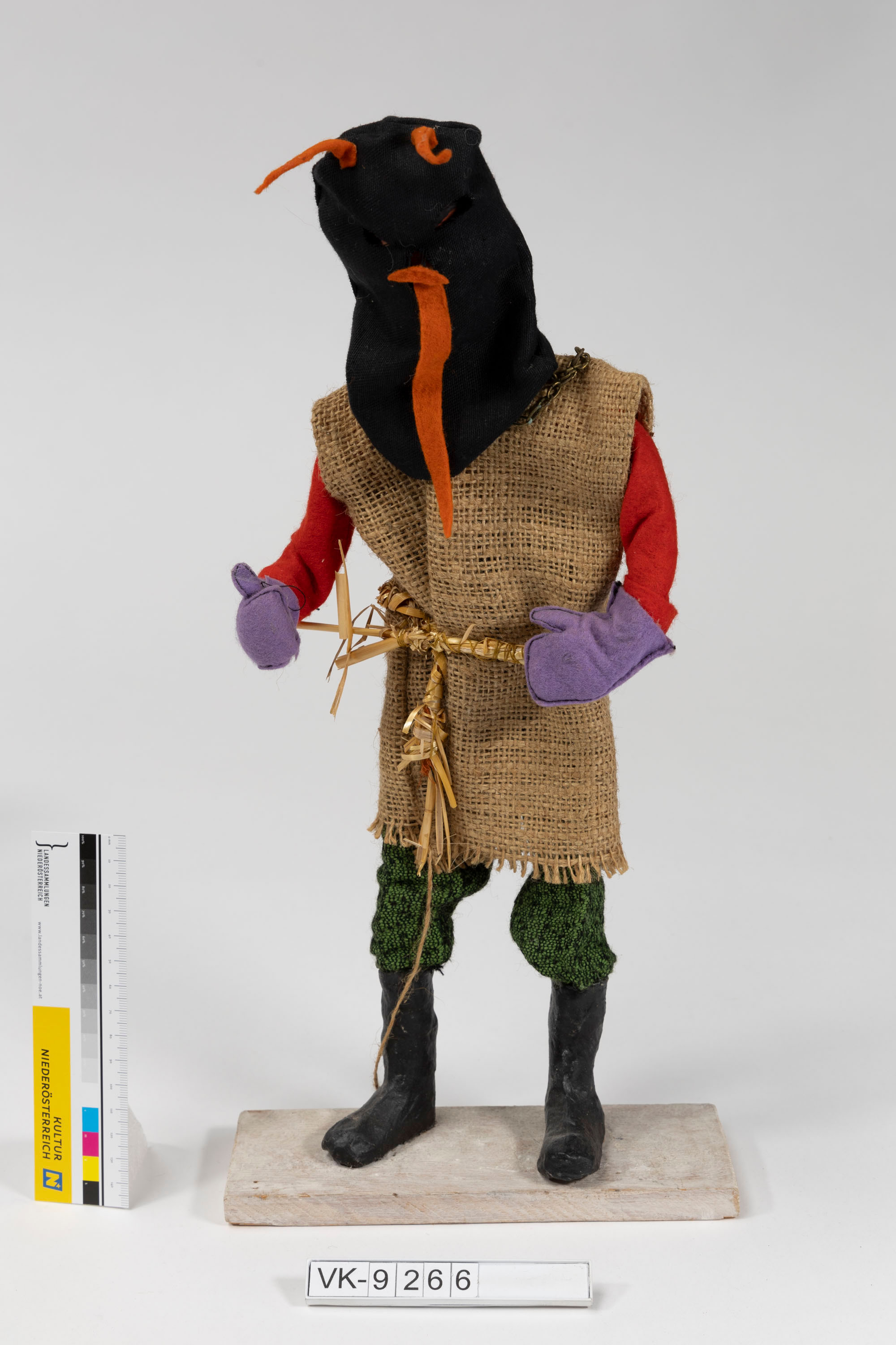 Krampusfigur mit schwarzer Maskenkapuze und einem Kleid aus einem Jutesack mit einem Strohgürtel. Die Figur trägt lila Fäustlinge und schwarze Stiefel, sie ist auf einem weißen Holzsockel befestigt. Angefertigt nach einem Foto aus Ebenthal, Weinviertel.