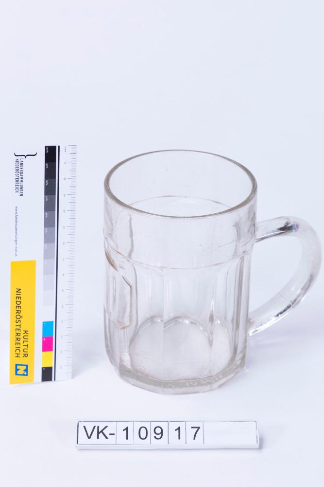 Bierglas mit Henkel, bis auf den Rand senkrecht profiliert, mit geätzter Beschriftung: Eichstrich, Maßzahl, "3 CRS 2".