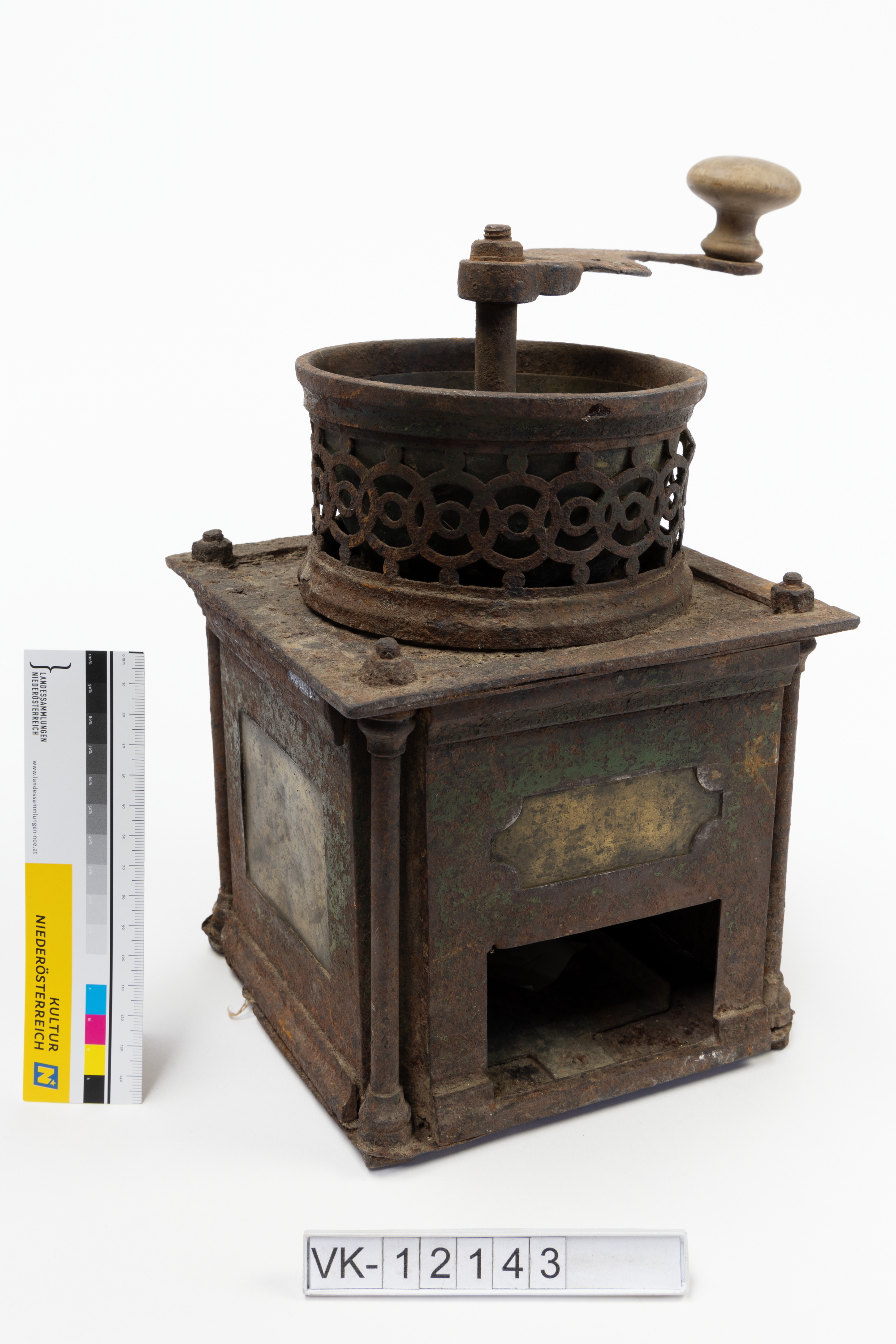 Kaffeemühle in Quaderform mit kleinen Säulchen an den Ecken, darauf ein runder Aufsatz aus gemustert gestanztem Blech mit einer geschwungenen Kurbel mit Holzknauf. Die Kaffeemühle hat eine Öffnung für die Lade.