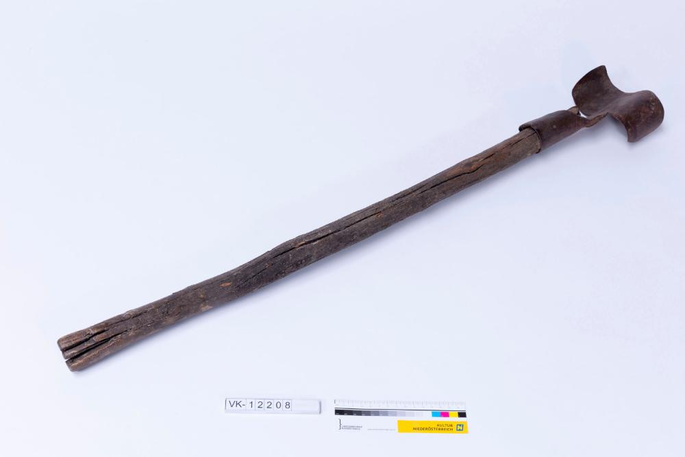 Stößel (Hackgerät) mit S-förmig gebogener Klinge, angeschmiedeter Tülle und einem Holzstiel.