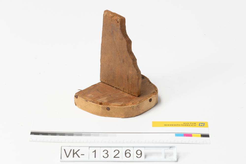 Sehr kleines Regal mit Stütze und einem aufgenagelten Kartonrand. Das Objekt stammt laut Inventarliste aus einer Bäckereieinrichtung.