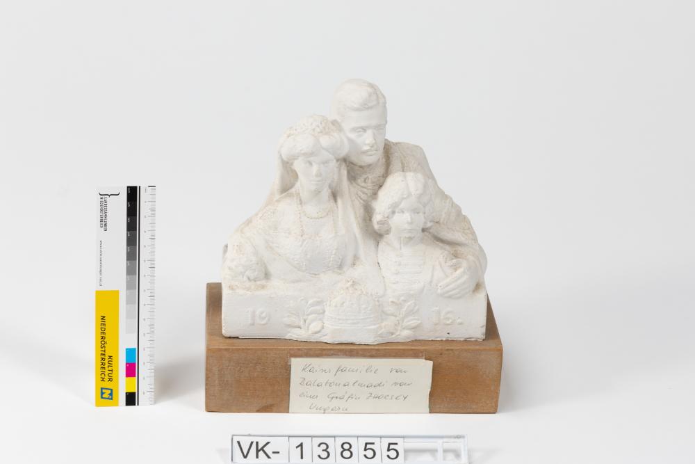 Gipsabguss auf einem Holzsockel: Kaiserfamilie um Kaiser Karl I, darunter eine Krone und das Datum 1916. Laut beiliegendem Zettel stammt das Objekt aus Balatonalmadi von Gräfin Zhorsky.