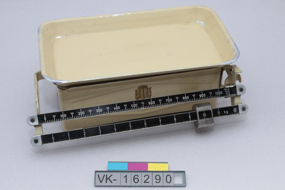 Küchenwaage (VK-16290a) mit zwei Skalen und einem Laufgewicht, das Gehäuse hat eine rechteckige Grundform und ein aufgedrucktes Markenzeichen: "HK", die Schale (VK-16290b) ist rechteckig mit ausgestelltem Rand. Waage und Schale sind glänzend beige lackiert.