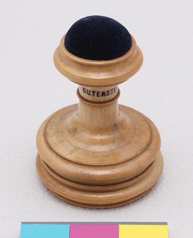 Kleines Nadelkissen aus dunkelblauem Samt auf einem gedrechselten Holzsockel mit großem Fuß, auf dem Sockel eine Beschriftung: "GUTENSTEIN".