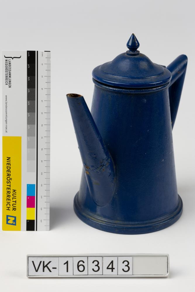Gusseiserne, blau lackierte, konische Kaffeekanne mit gestuftem Klappdeckel und einer konischen Röhre. Die Kanne hat einen Henkel, auf dem Deckel ist ein spitz zulaufender Knauf.