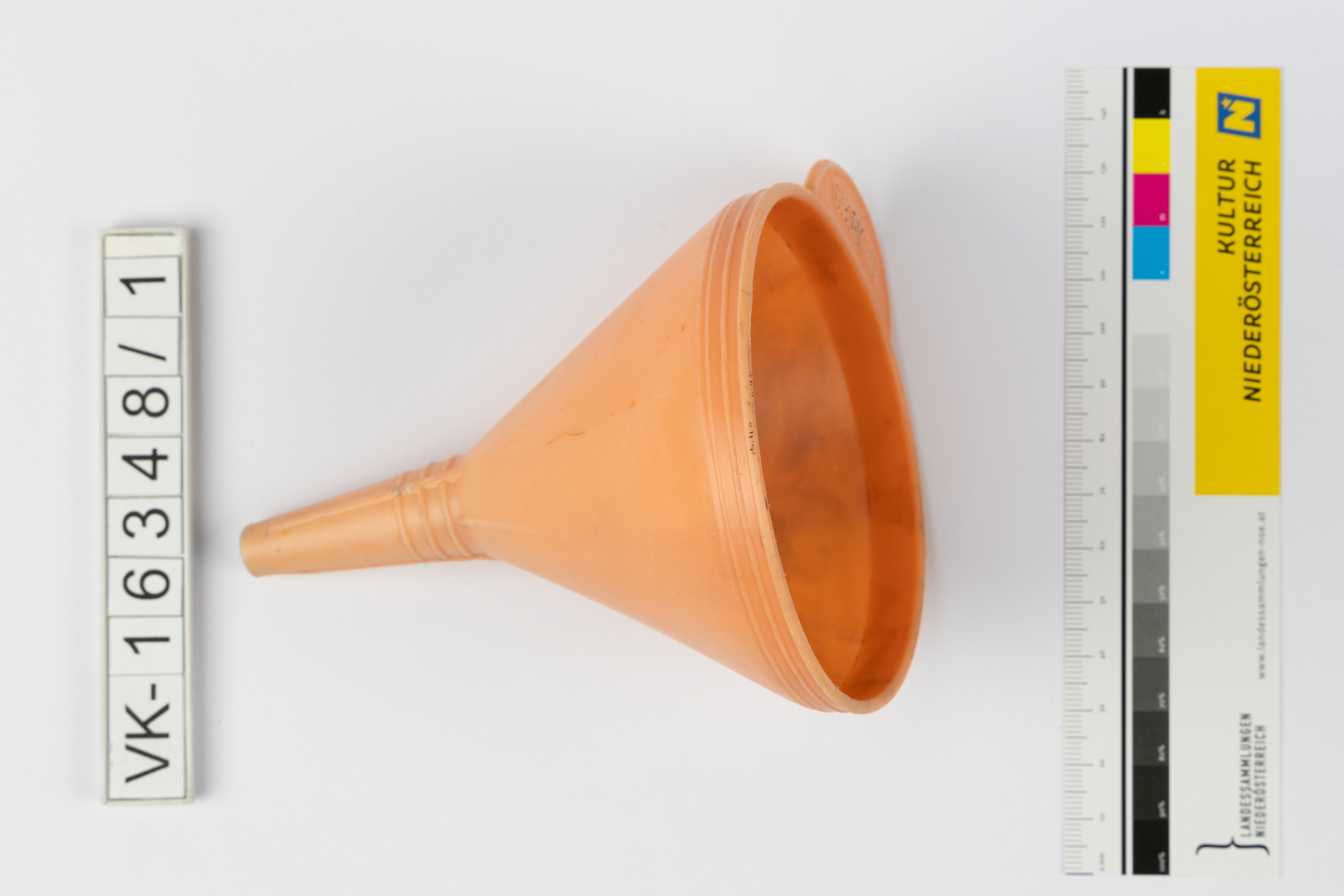 Lachsrosa Kunststofftrichter mit einem Griff, darauf die Aufschrift: "OETKER".