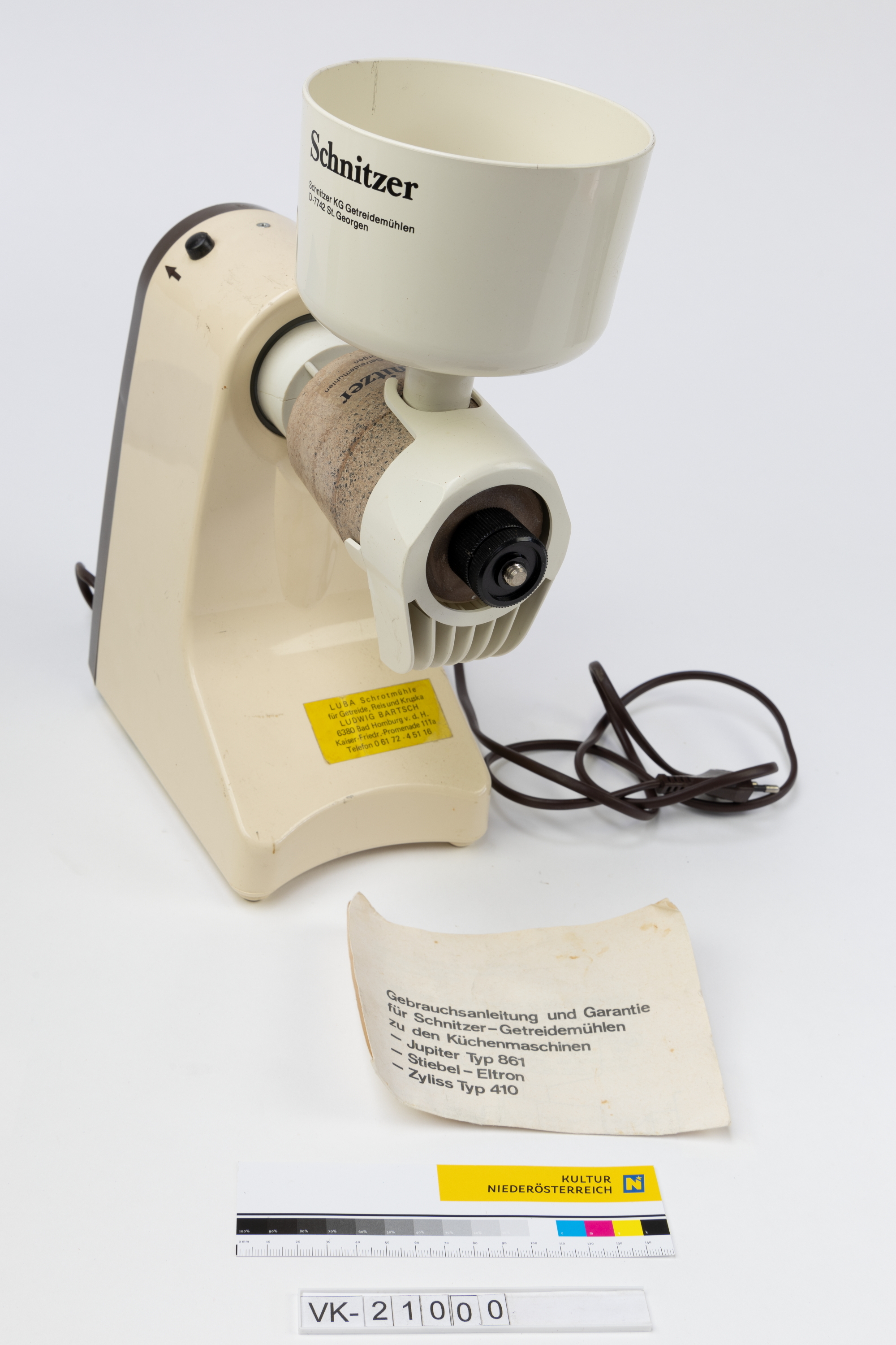 Elektrische Schrotmühle mit einem beigen Kunststoffgehäuse mit dunkelbraunem Deckel (VK-21000a). Die Schrotmühle hat ein Mahlwerk aus Naturstein (VK21000b) mit einem Kunststofftrichter (VK-21000c). Zu dem Gerät gibt es eine Gebrauchsanleitung (VK-21000d). Trichter und Mahlwerk sind bedruckt: "Schnitzer ...", die Maschine hat ein Etikett: "LUBA Schrotmühle für Getreide, Reis und Kruska ...".