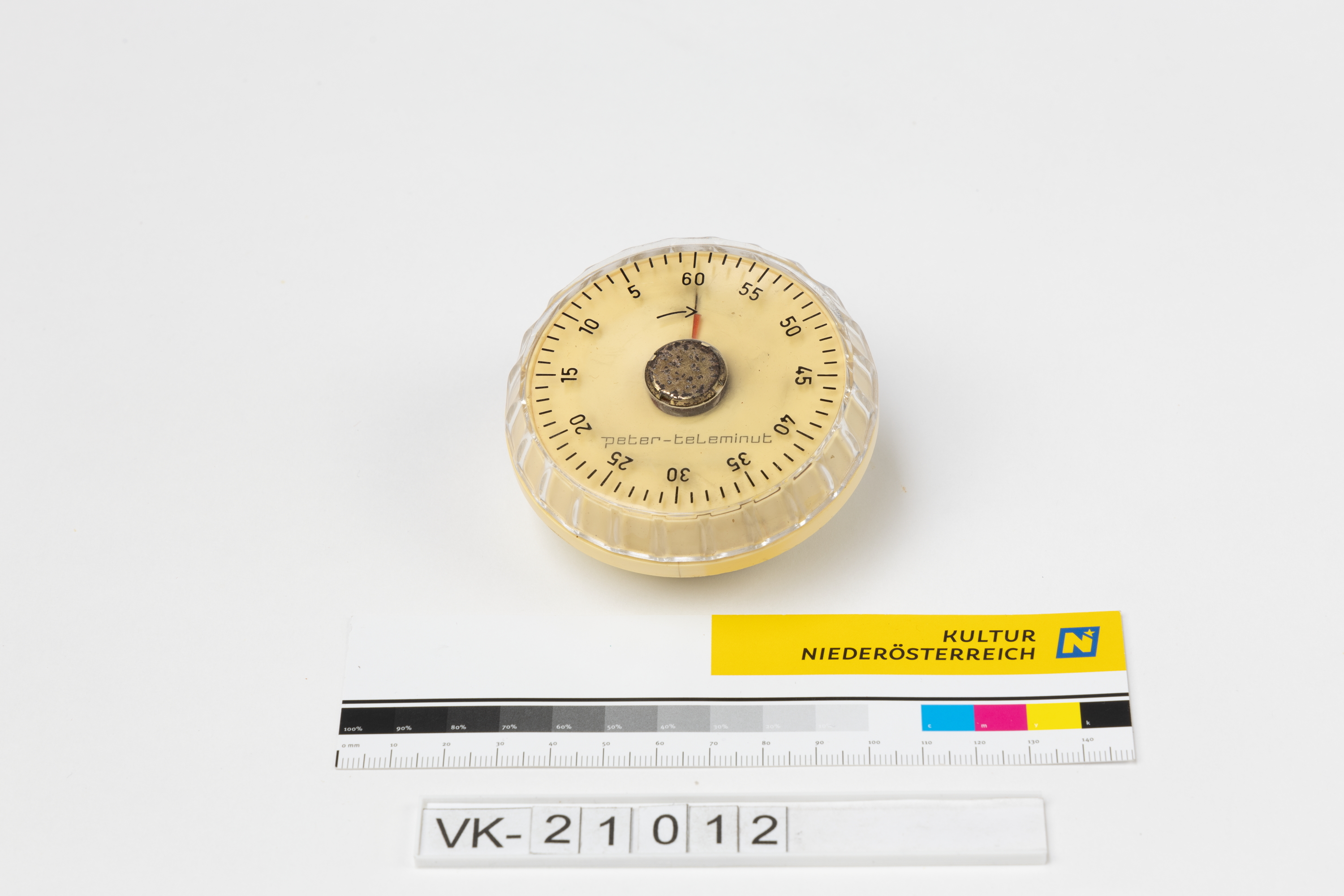 Flacher runder Küchenwecker aus beigem und schwarzem Kunststoff, die Scheibe mit Minuteneinteilung ist transparent. Der Wecker hat eine Beschriftung: "peter teleminut".