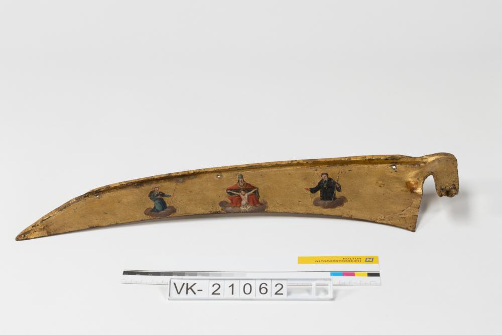 Sensenblatt mit Punzierungen, in Goldfarbe bemalt, mit mehrfärbigen Darstellungen (Sonntagberger Gnadenstuhl). Das Sensenblatt hat Löcher zur Wandbefestigung. Es sind Rest einer Datierung erkennbar: "18..".