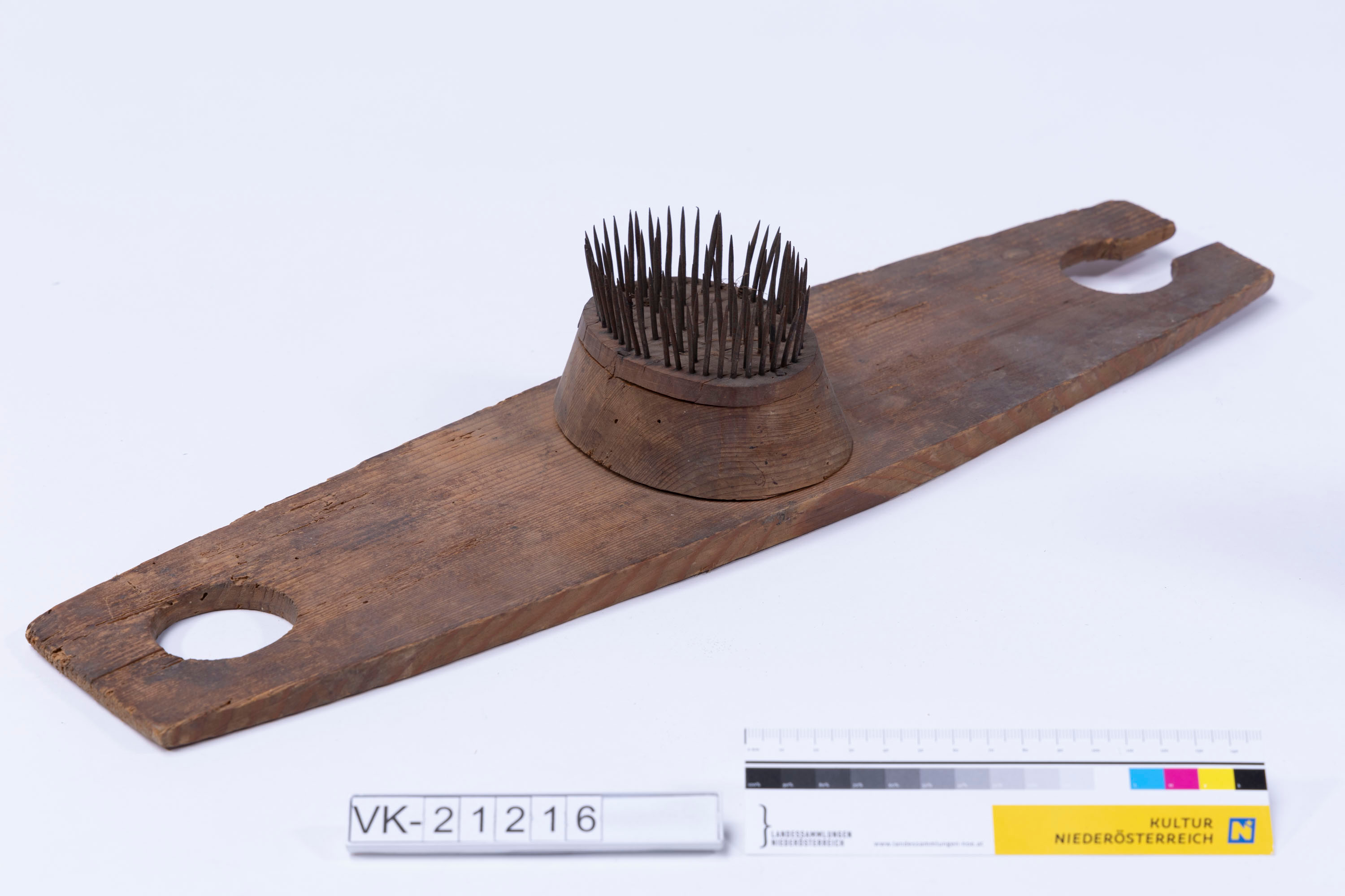 Hechel mit einem Griffbrett mit zwei Löchern, darauf ein ovaler Aufsatz mit Eisenzähnen.