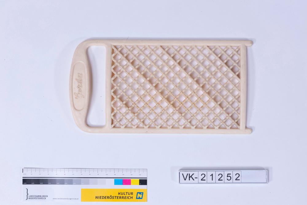 Rechteckige Reibe aus weißem Kunststoff, mit profiliertem Gitter und einem Haltegriff mit Aufschrift: "Gerda".