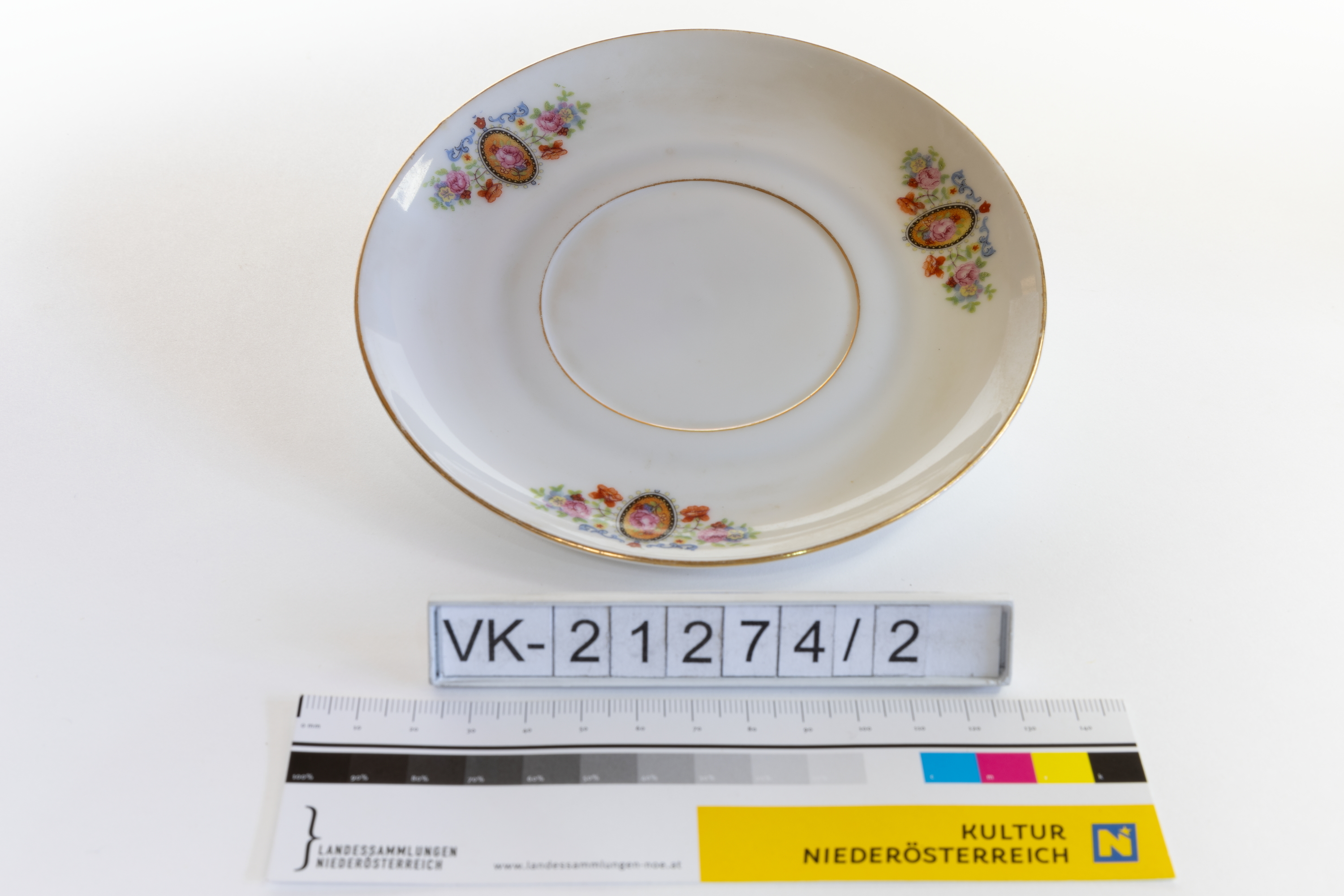 Flache Untertasse, mit leicht gebogener Wandung, Goldrand und einem goldenen Ring um den Spiegel. Die Untertasse ist mit drei Zierelementen (mehrfärbiges Rosenblütenmuster mit ornamentalen Elementen und einem Medaillon) gestaltet und hat am Boden einen Herstelleraufdruck: "MZ Altrohlau CMR MADE IN CZECHOSOLVAKIA".