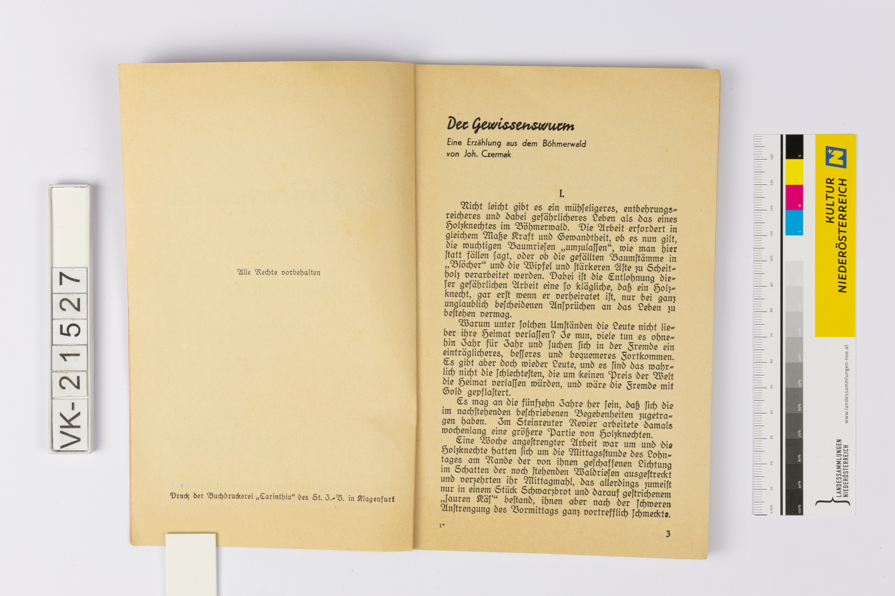 Rosa gebundenes Buch "Der Gewissenswurm UND ANDERE ERZÄHLUNGEN BUNTE GESCHICHTEN", 96 Seiten. Das Buch enthält verschiedene Geschichten, die Umschläge sind mit verschiedenen Werbungen für andere Publikationen bedruckt.