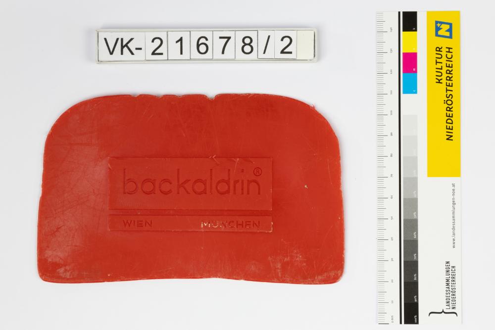 Annähernd rechteckige Teigkarte aus rotem Kunststoff, mit eingeformter Beschriftung: "backaldrin WIEN MÜNCHEN".