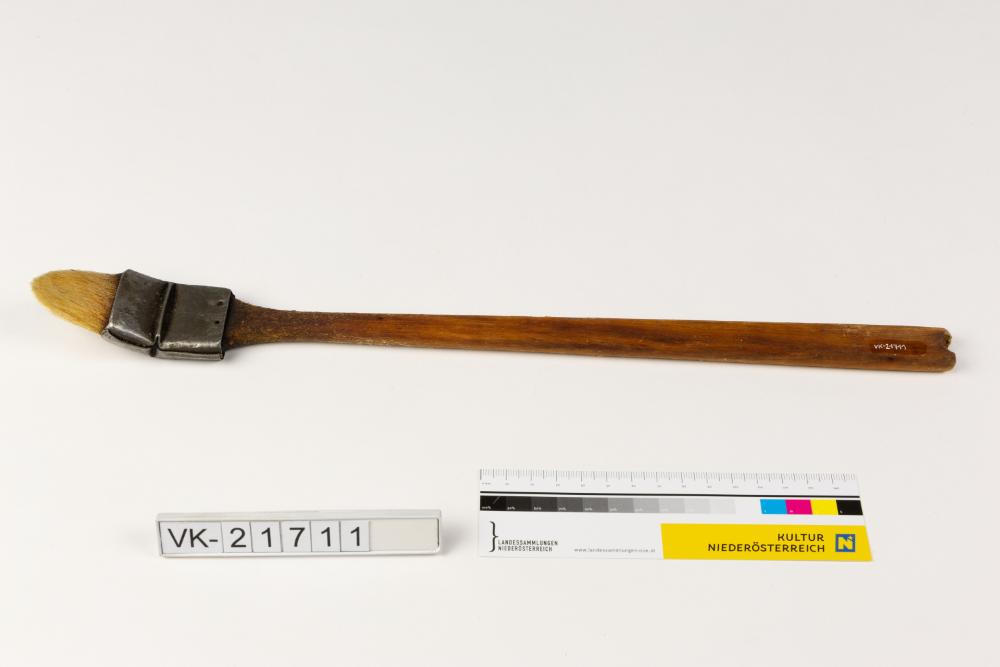 Flachpinsel mit langem Holzstiel, angewinkelter Metallzwinge und abgerundetem Borstenbüschel.
