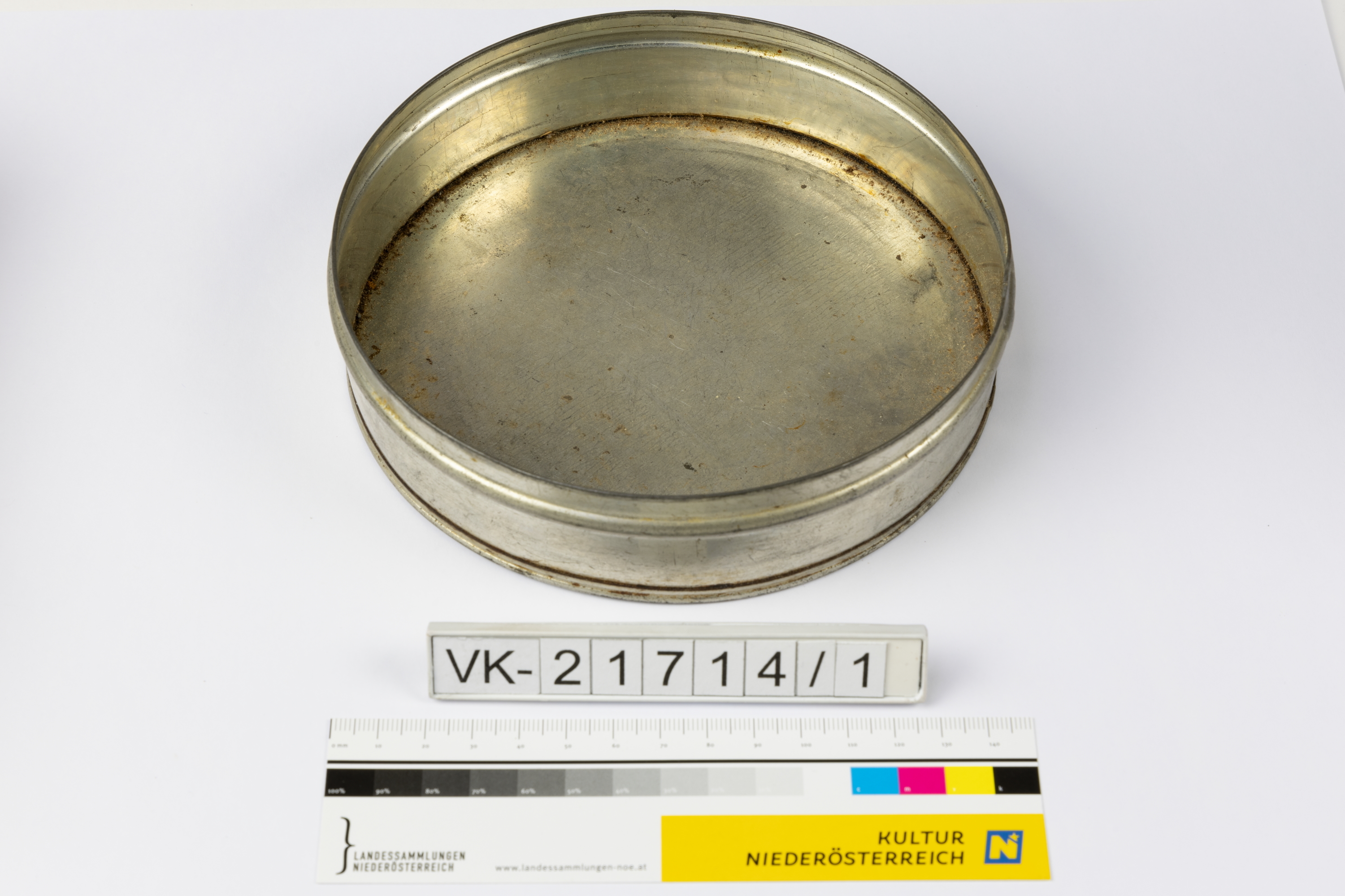 Runde Blechdose ohne Deckel. Darin befinden sich verschiedene Ausstechformen.