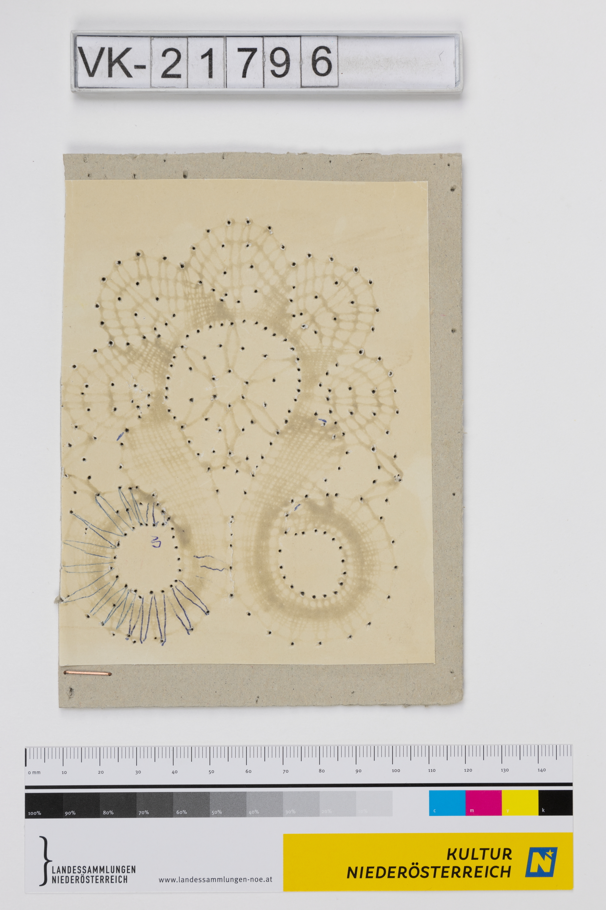 Klöppelbrief für ein Musterelement für eine Spitzenborte: Belichtetes Fotopapier, aufgeklebt auf einen braunen Karton, darauf handschrifltiche Ergänzungen der Zeichnung. Fr. Bracher veranstaltete in den 1970er- und 1980er-Jahren Klöppelkurse über den ÖFB.