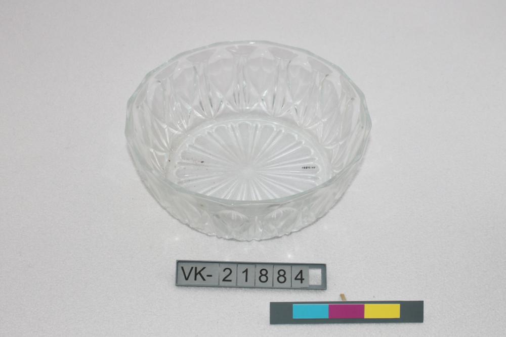 Runde Glasschüssel mit leicht gebogener Wandung und strukturiertem Dekor im Stil eines Kristallschliffs.