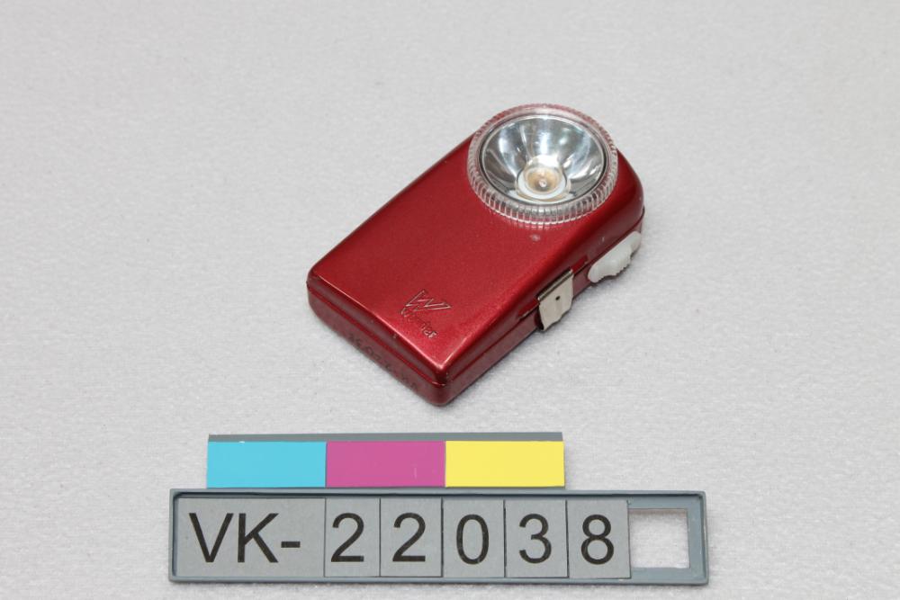 Rot lackierte, aufklappbare Taschenlampe aus Blech mit einem Kunststoffreflektor und einer Prägung auf der Vorderseite: "W wonder". Auf der Rückseite eine weitere Prägung: "MADE IN FRANCE". Die Lampe ist zum Betrieb mit einer Flachbatterie geeignet.