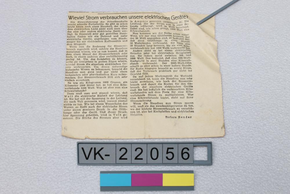 Zeitungsausschnitt mit einem Artikel zum Stromverbrauch elektrischer Geräte.