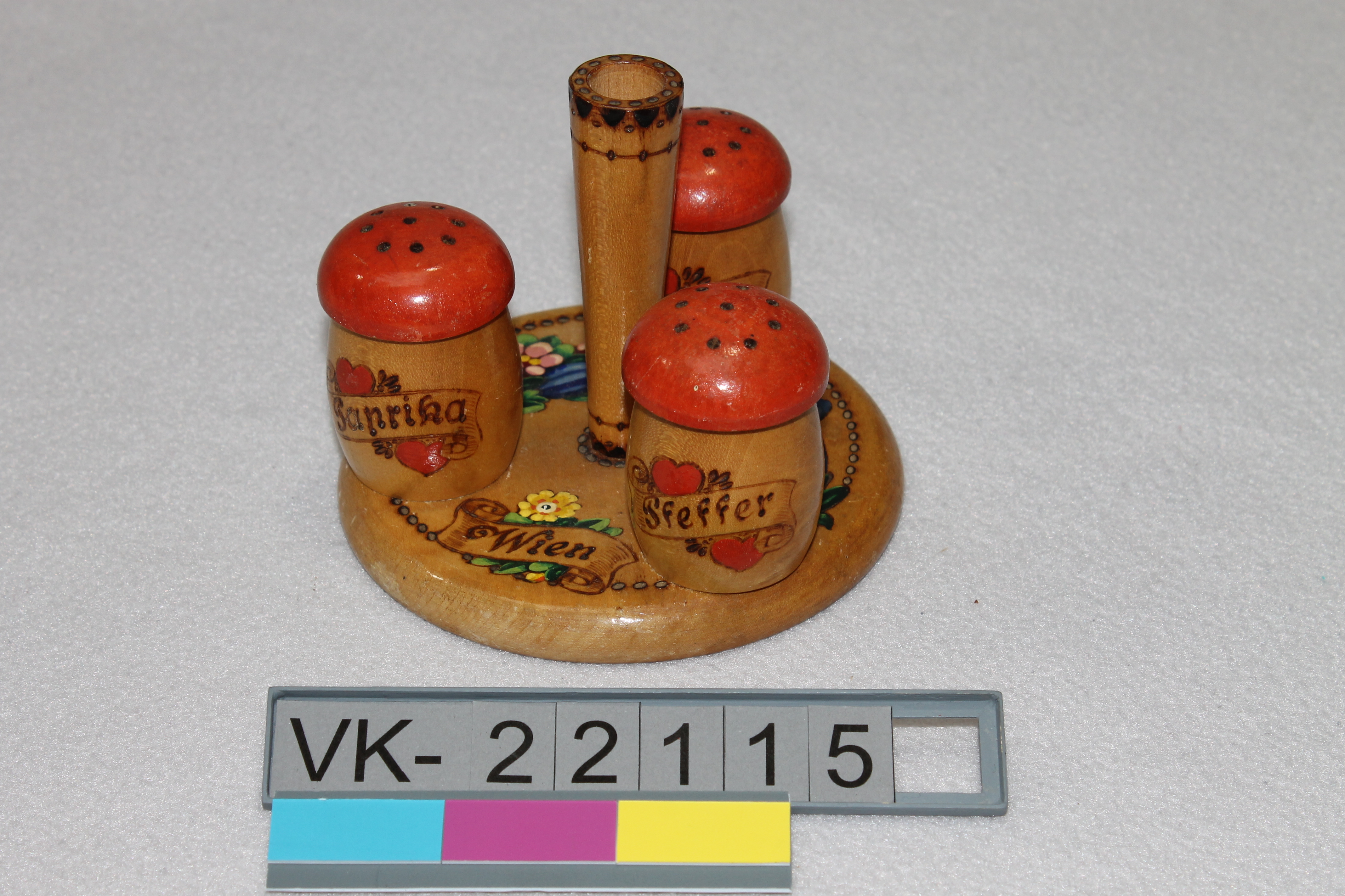 Ständer (VK-22115a) mit konischem Griff, darauf drei pilzförmige Gewürzstreuer mit Haltestift. Alle Teile sind mit Brandmalerei und gemalten Verzierungen gestaltet, der Ständer hat eine Aufschrift: "Wien", die Streuer sind mit "Salz" (VK-22115b), "Pfeffer" (VK-22115c) und "Paprika" (VK-22115d) beschriftet.
