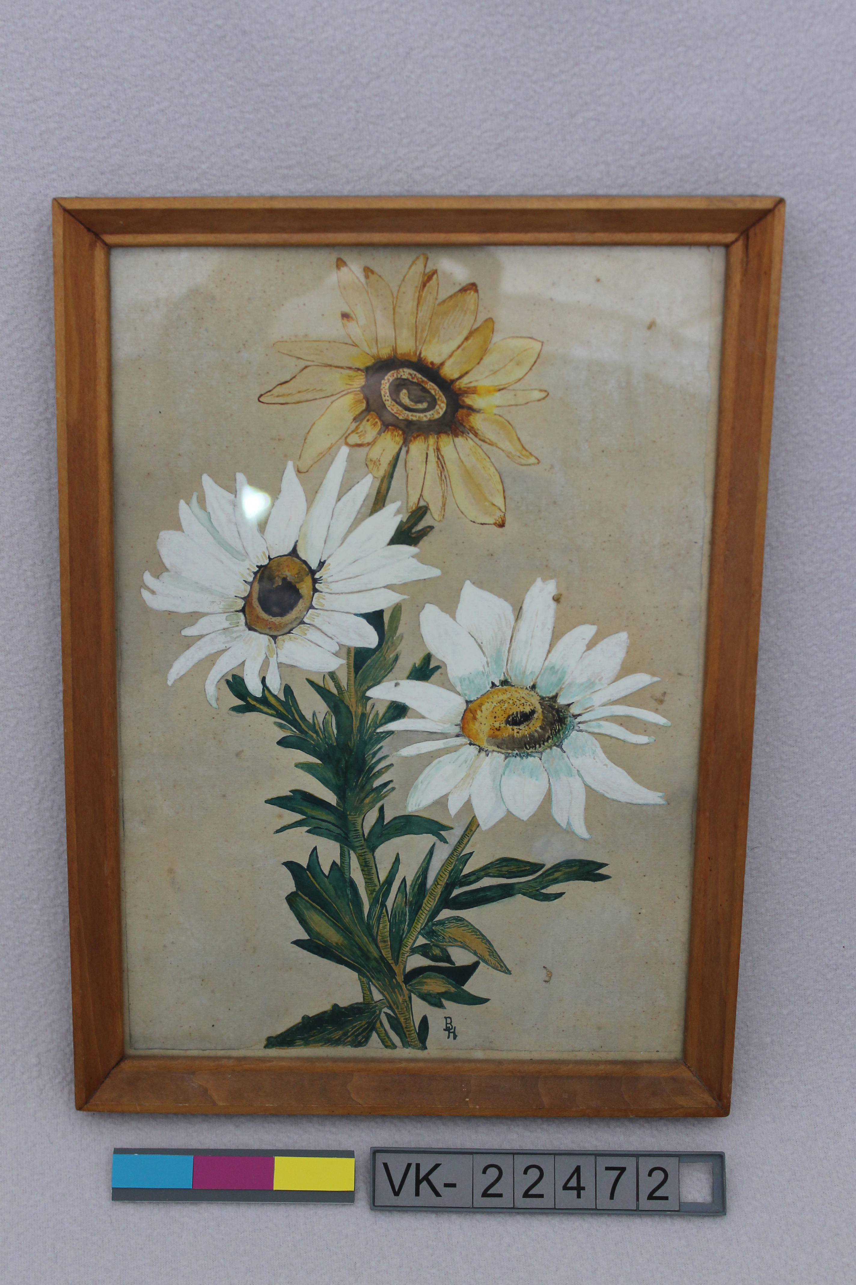 Bild hinter Glas in einem braunen Holzrahmen: Blumen ohne Hintergrund, signiert: "BH".