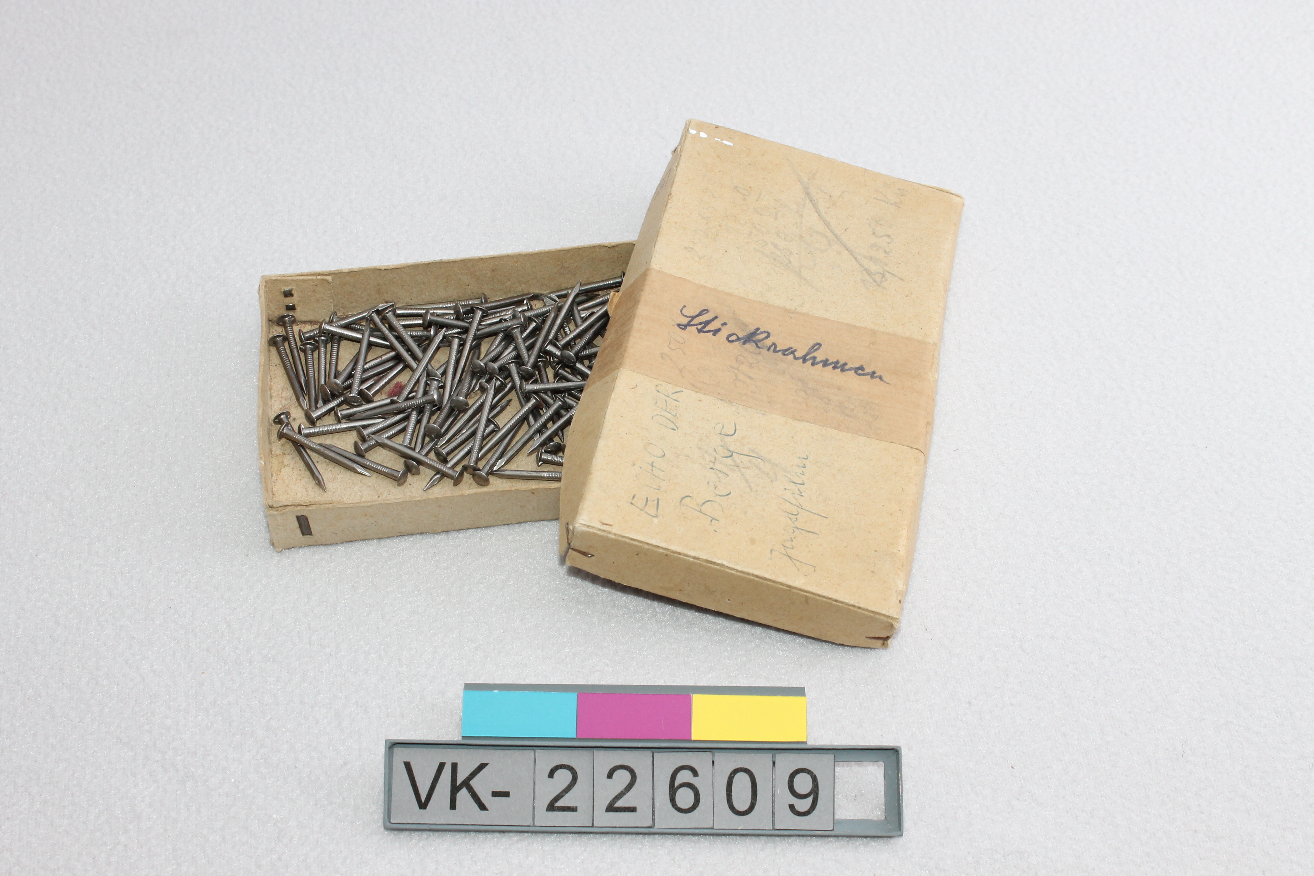 Kartonschachtel (VK-22609a) mit Deckel (VK-22609b), darin ein Konvolut Eisennägel mit rundem Kopf. Der Deckel ist mit diversen handschriftlichen Beschriftungen versehen.