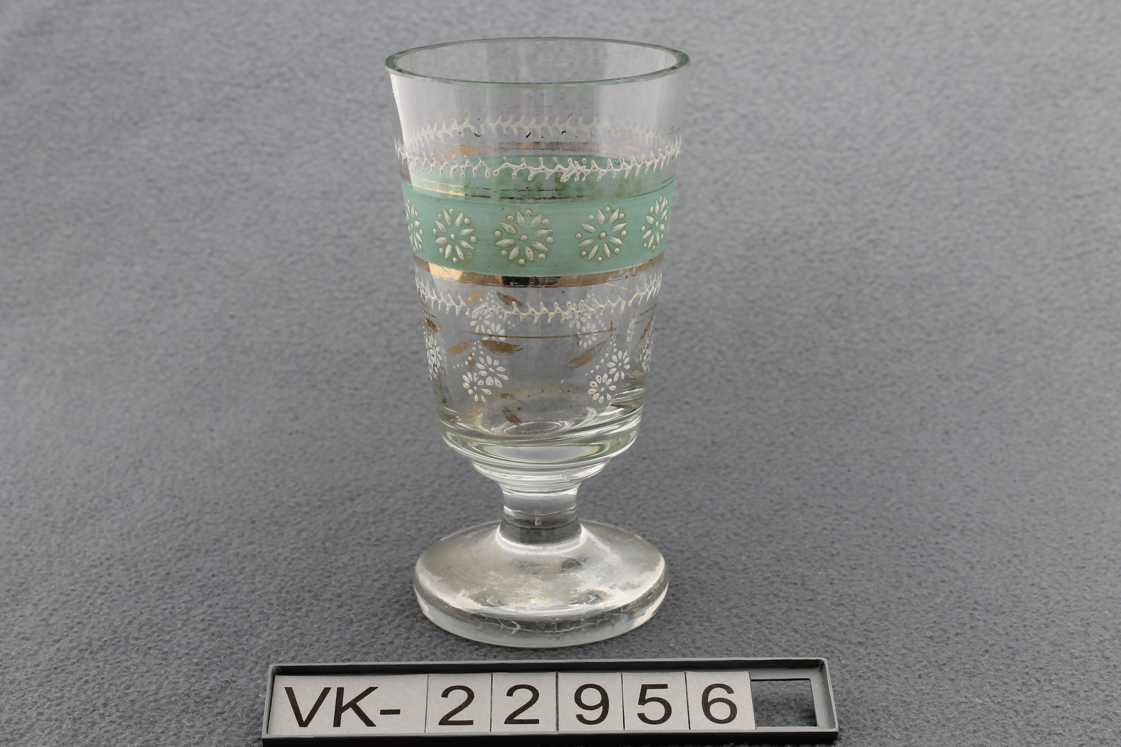 Konisches Weinglas mit kurzem Stiel und rundem Fuß. Das Glas ist umlaufend mit floral-ornamentalem Muster in weiß mit Goldelementen, zum Teil mit grünem Hintergrund, verziert. Unter dem Rand sind Reste einer Beschriftung erkennbar.