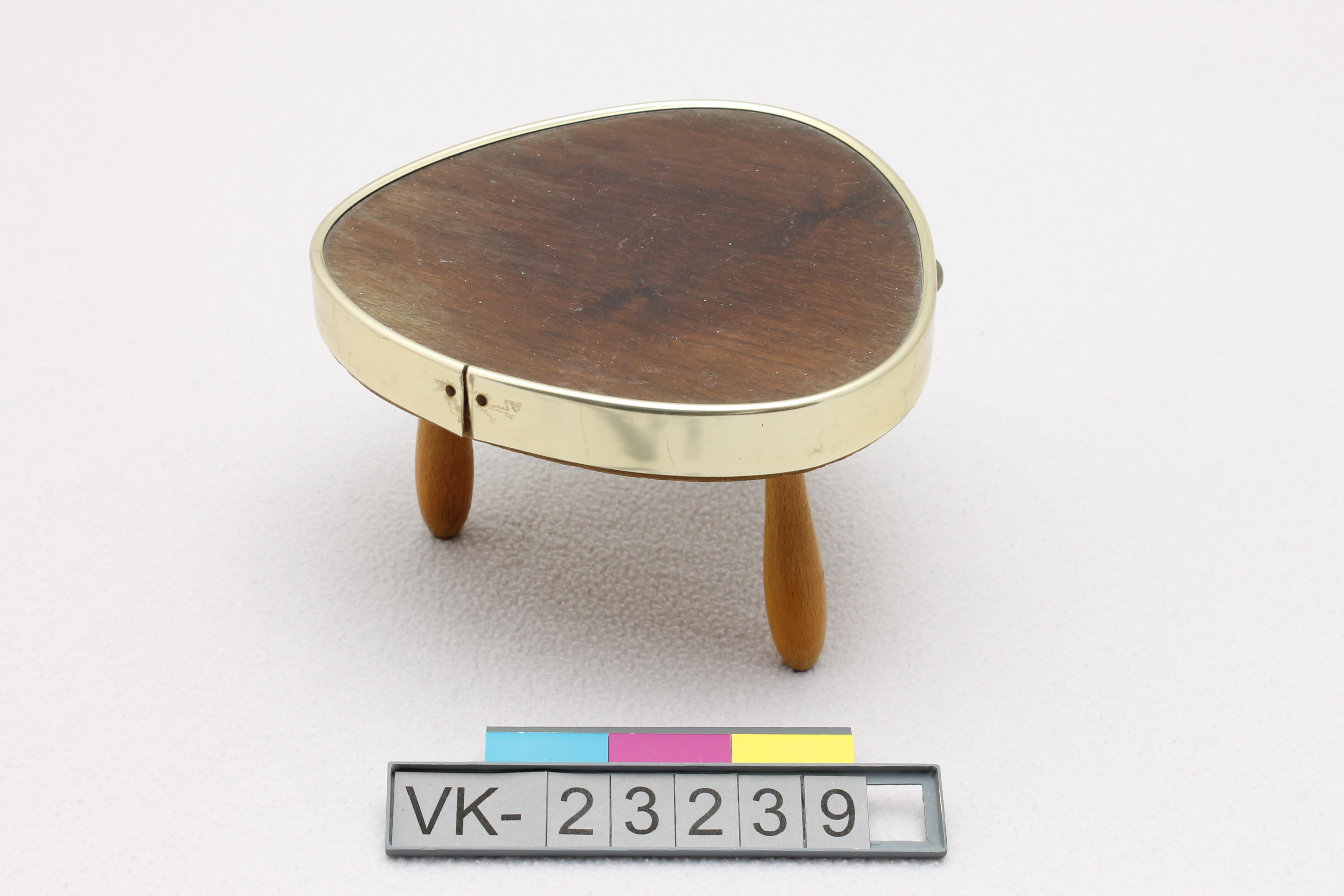 Dreifüßiges, annähernd dreieckiges, abgerundetes Holztischchen, eingefasst mit einer Aluminiumblechleiste. Das Tischchen ist für Pflanzen oder als Zierobjekt verwendbar.