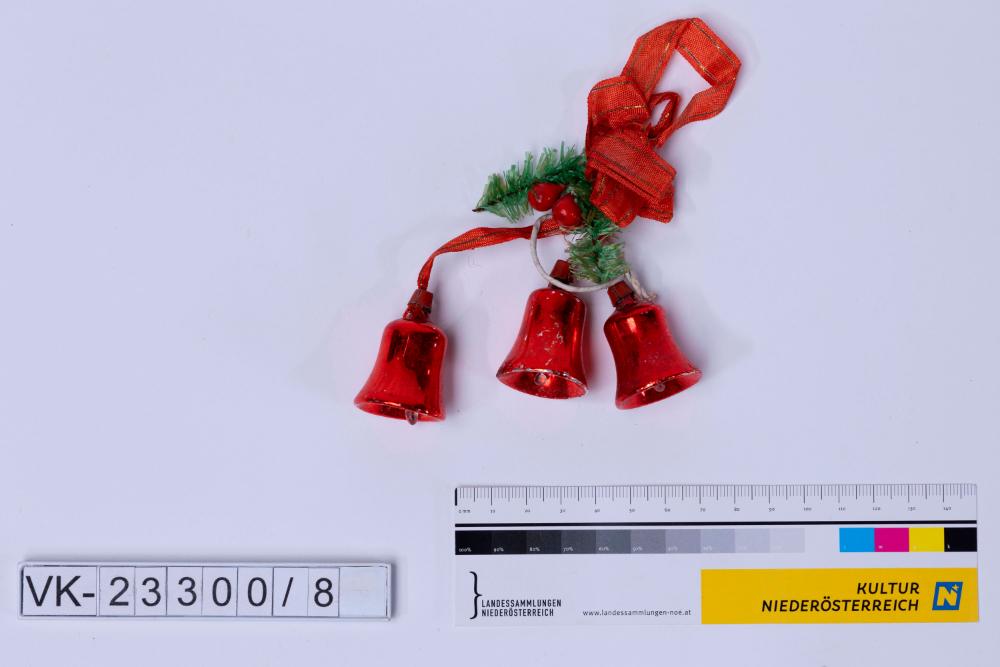 Drei rote Glasglöckchen an einem roten Ripsband mit einem künstlichen Tannenzweig, an dem rote Beeren befestigt sind. Das Objekt befindet sich auf dem Restaurierungstisch.