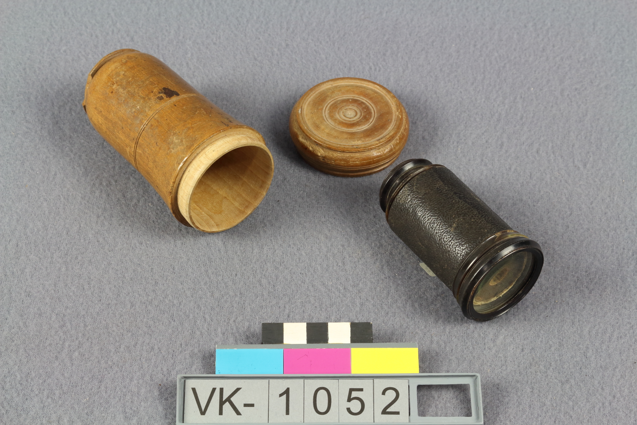 Opernglas (VK-1052a) mit Holzbehälter (VK-1052b und VK-1052c). Das Opernglas ist einäugig ausgeführt und im Griffbereich mit Leder bezogen.