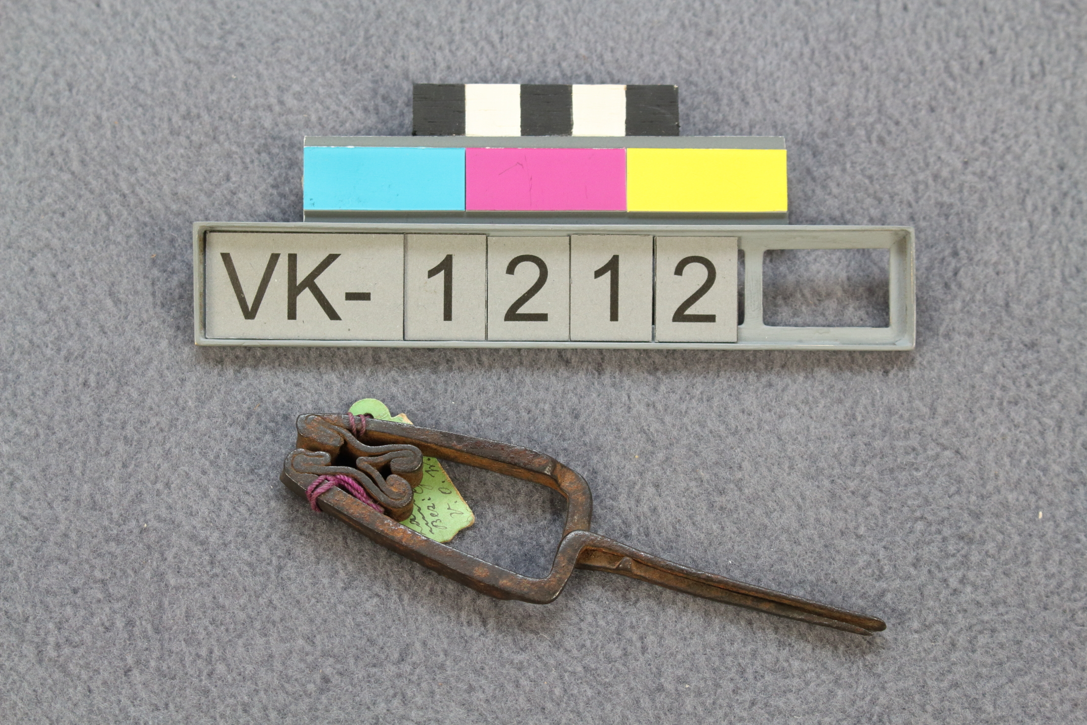 Schmiedeeiserne Pinzette mit mehrfach gefaltetem Federelement. Laut Inventarbuch handelt es sich um ein Feuerzeug.