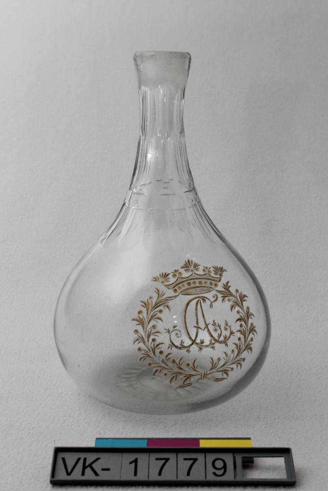 Kugelige Flasche mit konischem profiliertem Hals und einer Goldverzierung: Krone, Blätterkranz, Initialen "CA".