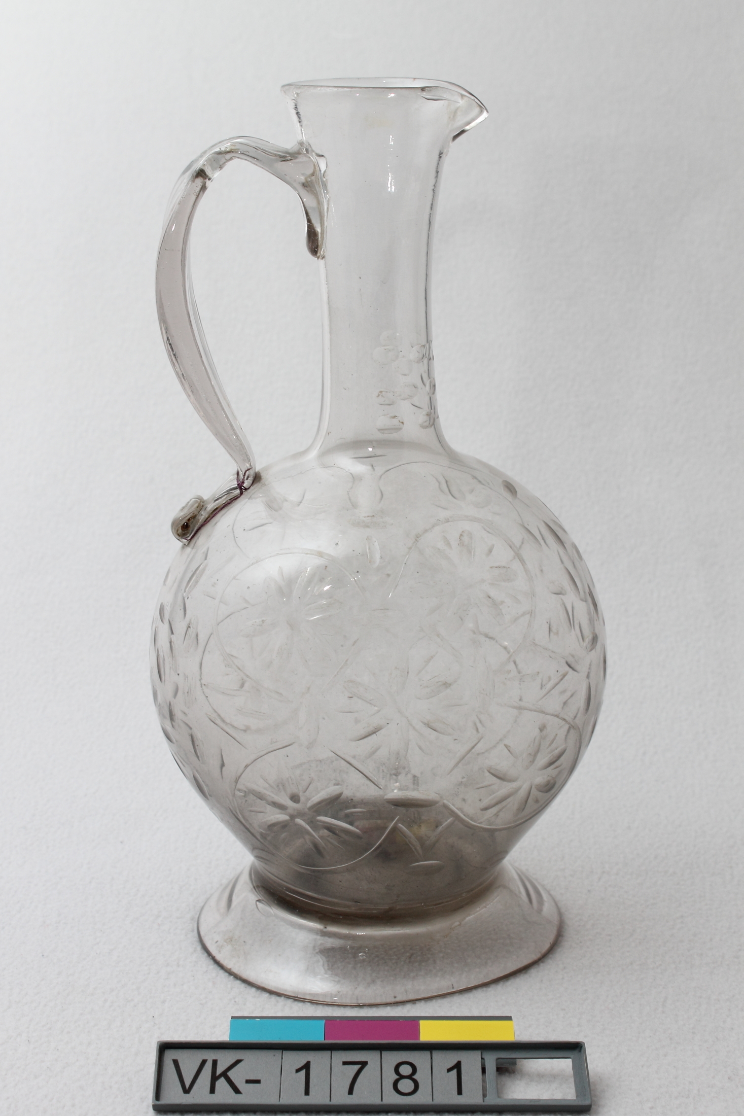 Kugelige ornamental verzierte Kanne mit schmalem Hals und einem Henkel.