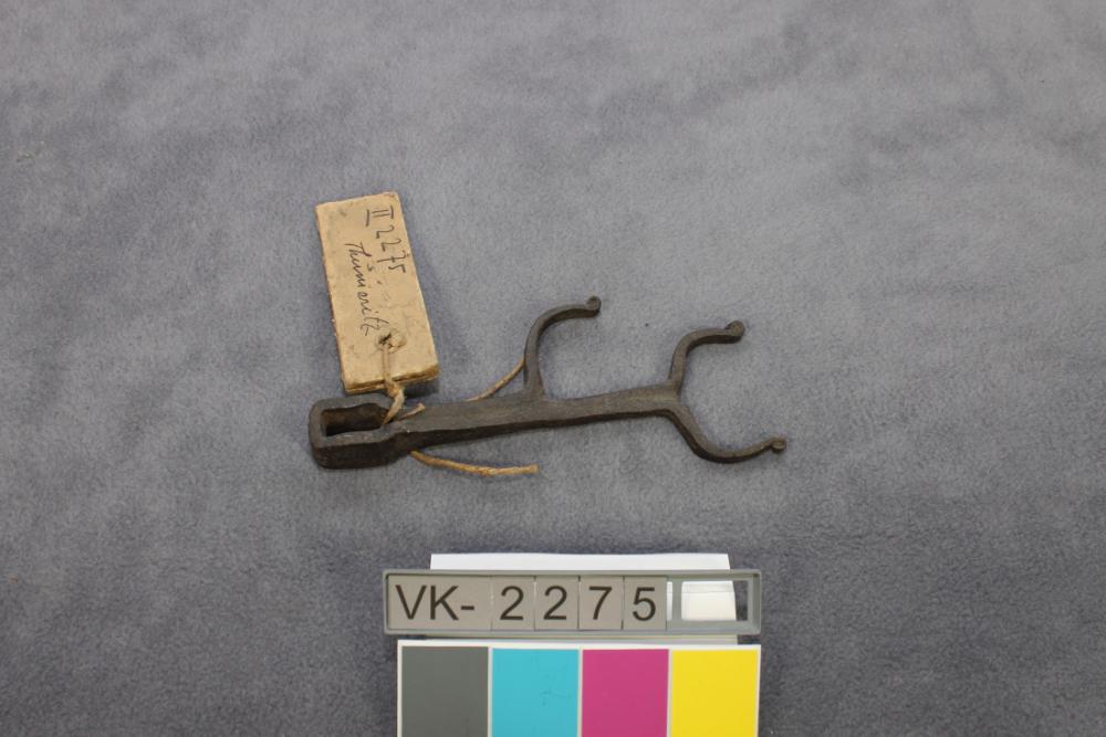 Teil (a) eines vermutlich in der Sammlung vorhandenen Pfannenuntersetzers (Pfannenknechtes): Verschiebbares Element mit Öse, Strebe und zwei Haken.
