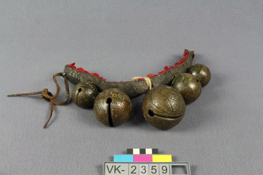 Schafschellenband mit einem Ledergurt, der mit rotem Filz besetzt ist, darauf fünf kugelige Bronzeschellen mit einfachen Verzierungen.