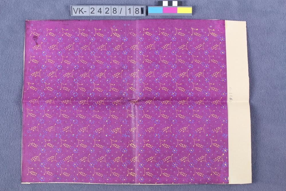 Rechteckiges ausgeschnittenes Stück einer Tapete. Muster: Kleine Blüten- und Ährenmotive in gelb und hellblau auf violetter Grundfarbe. Wie VK-2428_21, ähnlich wie VK-2428_31 und VK-2424.