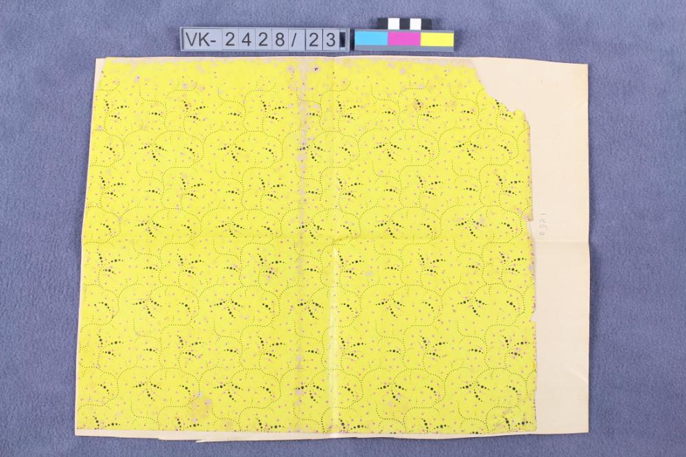 Rechteckiges ausgeschnittenes Stück einer Tapete. Muster: Gepunktete Linien in schwarz und rosa auf gelber Grundfarbe. Ähnlich wie VK-2428_16.